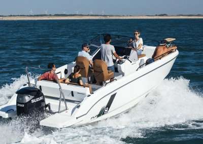 Our flagship powerboat “Super 8” is a Flyer 8 SpaceDeck, one of the new designs in the Flyer range from the French shipbuilder Beneteau. These new boats are modern and elegant with a distinctively sporty powerful look.